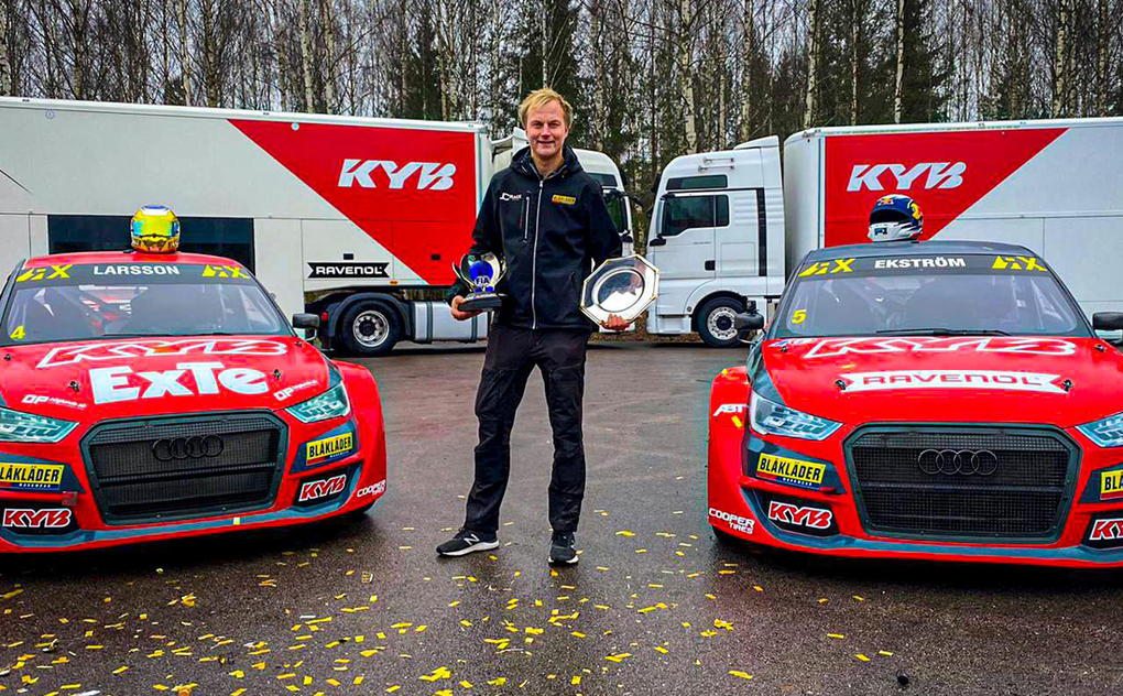 Im Einsatz für das KYB Team JC feiern die beiden schwedischen Audi-Piloten Mattias Ekström (42) und Robin Larsson (28) den Gesamtsieg in der Teamwertung der FIA WRX. Nach der Absage des letzten Laufs der Rallycross-Weltmeisterschaft auf dem Nürburgring standen die diesjährigen Weltmeister vorzeitig fest. Gute Platzierungen der Audi-Piloten in der Einzelwertung, P2 und P6, führten das von RAVENOL technisch unterstützte Team (Einsatzfahrzeuge: Audi S1 EKS RX quattro) an die Spitze der Teamwertung, während der ebenfalls aus Schweden kommende Volkswagen-Pilot Johan Kristoffersson die nun insgesamt dritte WRX-Weltmeisterschaft (nach 2017 und 2018) für sich entschied.