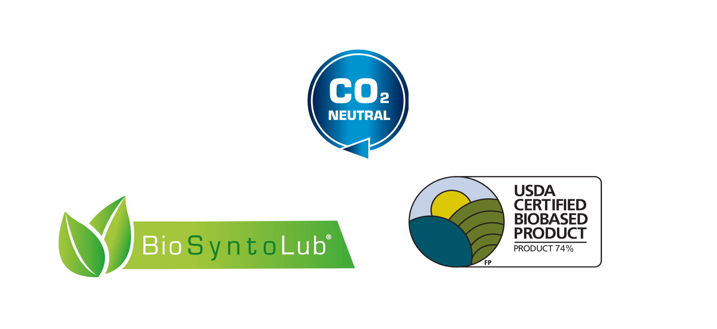 Alle Produkte dieser Serie tragen das USDA®, BioSyntoLub® und CO2-neutral Logo auf dem Etikett.