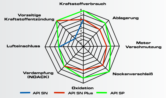 Der Vergleich in der Grafik zeigt, dass die Anforderungen im Vergleich API SP mit der API SN Plus ähnlich geblieben sind, jedoch in vielen Bereichen noch einmal durch die neu entwickelten Motorentests verschärft wurden. Wenn man jedoch die API SP mit der API SN vergleicht ist der besondere Fokus auf die Verhinderung der vorzeitigen Kraftstoffentzündung (Test Seq IX) erkennbar, der zuvor nicht getestet wurde: